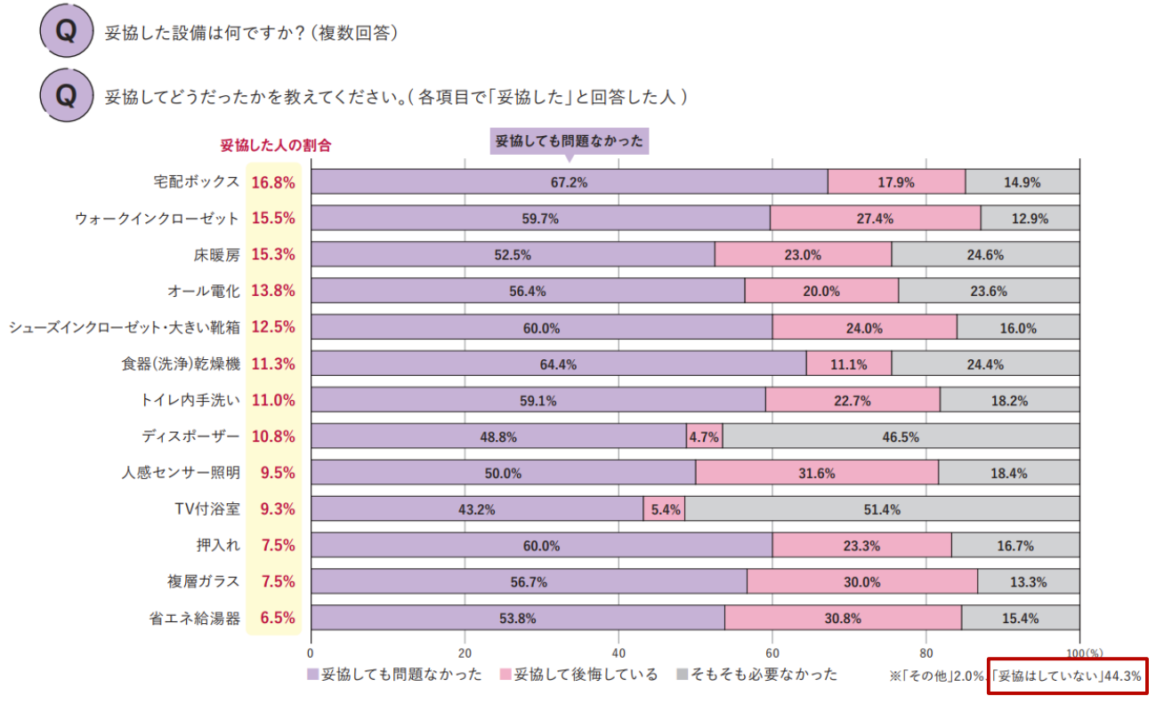 一方、住まいの設備について44.3%が「妥協はしていない」と回答。条件を妥協していない人の割合19.0%と比べ割合が高いことから、多くの住宅購入者が住まいの設備にはこだわって選んでいることがわかった。