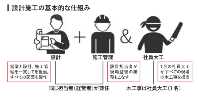 ◉同社の社員は小野氏と大工の2人。小野氏は営業から設計、施工管理、アフターメンテナンスまで担当。大工は基本的に大工事のみ。大工に現場監督を兼ねてもらうのが理想だが現実には難しい。