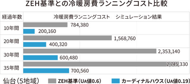 寺岡モデルハウスは、同社が2022年8月に発表した新構法「CARDINAL HOUSE BES-T 019」(カーディナルハウス ベスト ゼロ・ワン・ナイン)にて建築。同社が提供してきた外断熱・基礎断熱に加え、内断熱(充填断熱)と基礎内部の断熱、土間下部分も断熱することで、最高断熱等級7を超えるUA値0.19W/㎡Kを実現した。また、天井の断熱も従来より強化している。同物件では、ZEH基準の住宅性能よりも冷暖房費を約75%削減でき、35年間の差額は204万4770円になるという。