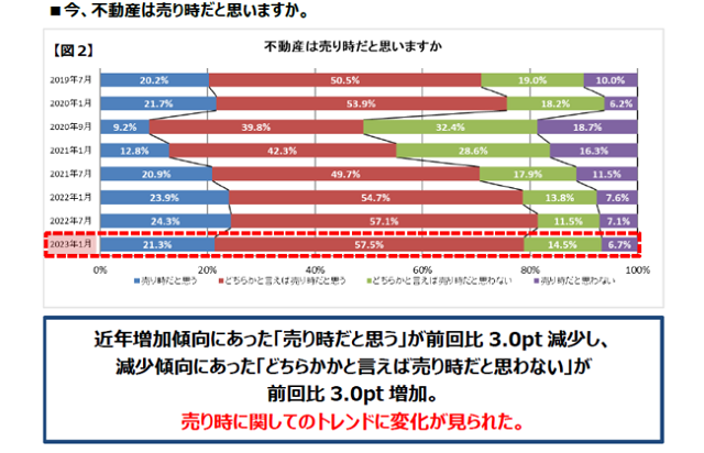不動産の売り時に関しては、増加傾向だった「売り時だと思う」が21.3%と前回比3.0ポイント減少。一方、減少傾向だった「どちらかかと言えば売り時だと思わない」が同3ポイント増の14.5%となり、売り時に関するトレンドが変化。売り時だと思う理由で最も多かったのは「不動産価格が上がった」で、「好条件での売却が期待できる」が続いた。ただ、「低金利で購入しやすい環境」が4.6ポイント減少、「今後の不動産価格が下がる」が4ポイント増加しており、今後の金利・価格の変動による動向を懸念する様子がうかがえる。