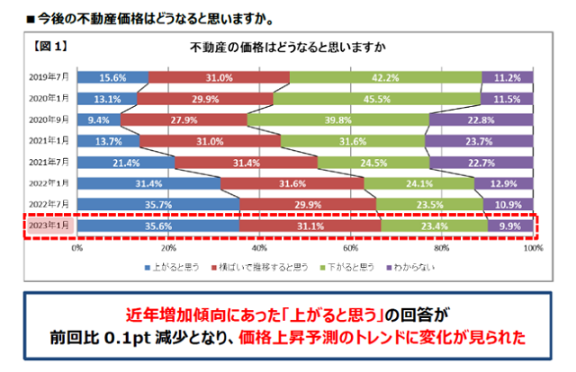 野村不動産ソリューションズ(東京都新宿区)は3月7日、不動産の購入検討者に実施した「住宅購入に関する意識調査(第24回)」の結果を発表した。有効回答数は2376人。今後の不動産価格がどうなると思うか聞いたところ、「上がると思う」は前回比0.1ポイント減の35.6%だった。近年、増加傾向にあった価格上昇予測のトレンドに変化がみられた。