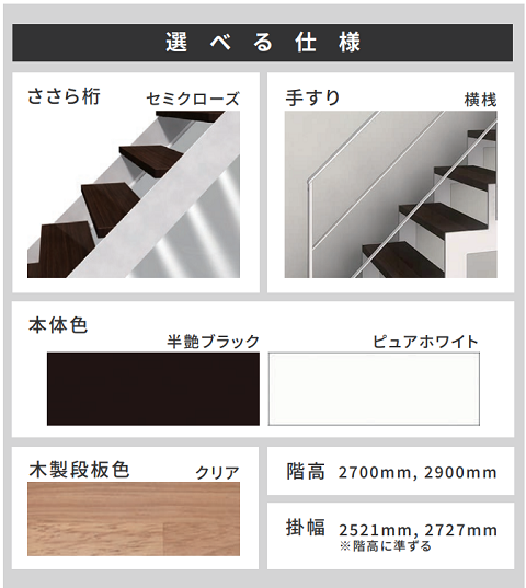 同サービスで販売する階段の仕様は、ささら桁:セミクローズ、手すり:横桟、本体色:半艶ブラックまたはピュアホワイト、木製段板色:クリア、階高(掛幅):2700mm(2521mm)、2900mm(2727mm)。