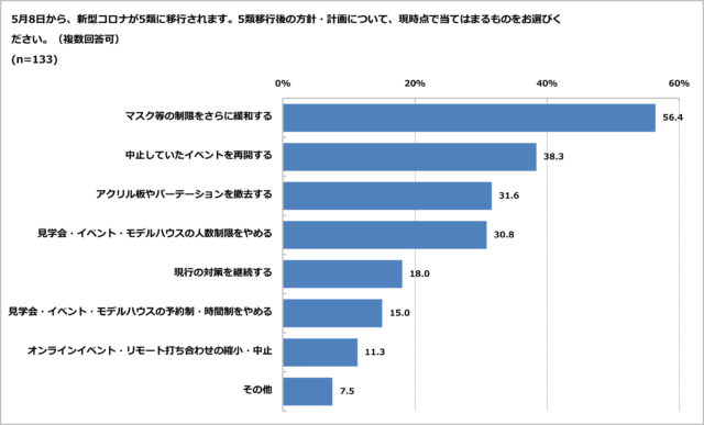 政府はまた、5月8日から新型コロナの感染症法上の分類を、インフルエンザ等と同じ5類に移行する方針だ。5類移行後は、回答者の半数以上がマスク等の制限をさらに緩和するとした。一方で、見学会やイベントの予約・時間制やオンライン活用をやめるとの回答は1割前後にとどまった。