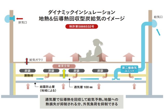 同工法では、床下の防湿コンクリートの上に高さ10㎝ほどの発泡スチロールのスペーサーを並べ、その上にポリカーボネート板を載せて通気層を確保。ポリカーボネート板の上にウレタンを吹き付けて断熱しながら、数カ所の吹き出し口を設ける。第二種換気の給気をこの通気層に送り込み、地熱と床下から地盤に逃げていく熱の両方を回収しながら通っていく空気を予熱。予熱された空気は、第二種換気の給気ファンの圧力によって吹き出し口から床下へと押し出され、それが床ガラリを通じて1階の室内へと放出される。