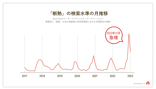 「節電」とともに、「断熱」も注目を集めている。2022年12月以降、「断熱」というワードを含むキーワードの検索率が急増しており、検索水準は昨年比で2.6倍となった。住まい環境自体のより根本的な対策にも目が向いていることがわかる。