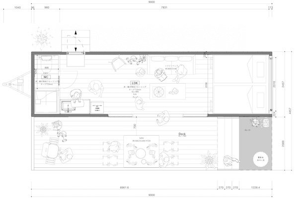 これまでの20ftサイズは、L6m×W2.5m、8畳の広さがあったが、今回の30ftロングタイプはL9m×W2.5m、12.5畳へと大幅にサイズアップした。ベッドに加え、ソファやダイニングテーブルなどを置いて大人数でも過ごしやすくなった。