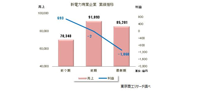 最新期決算3期連続比較可能な124社の売上高合計は、前期比6.3%減の8兆5281億円と減収に転じ、利益合計も1068億円の赤字となった。電力小売自由化で、新電力市場は拡大を続けたが、電力需給ひっ迫や調達価格の高騰などにより事業環境が悪化。サービス停止などで売上が減少し、2億円の赤字だった前期から赤字幅がさらに拡大した。
