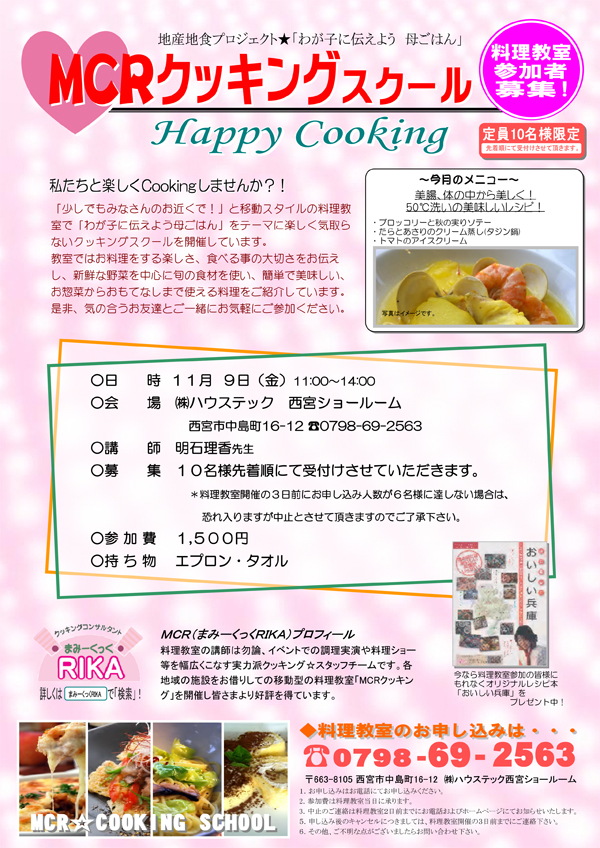 ハウステック(東京都板橋区)は11月9日、兵庫県西宮市にある西宮ショールームにおいて、地産地食プロジェクト「わが子に伝えよう母ごはん」をテーマにしたクッキング教室を開催する。 当日は、ブロッコリーと秋の実りソテー、タジン鍋を使ったたらとあさりのクリーム蒸し、トマトのアイスクリームなど地元食材を生かしたレシピを紹介。定員10人。参加費用は1500円。予約は同ショールームまで。TEL0798・69・2563。