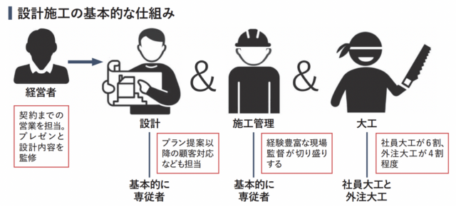 ◉同社は営業の専任者が不在で社長の関尾氏が営業を担当。社員は設計担当6人(メイン担当3人とパートのサブ担当3名)と現場監督2人。設計担当の1人は広報兼任。いずれは広報専任とする予定