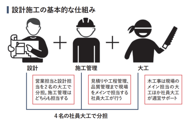 ◉同社社員は全員が大工。代表の清川伸二氏と息子で専務の創史氏、常務の太視氏のほか原口晴郎氏の4人体制。伸二氏はリフォーム全般を担当。創史氏は設計と施工管理、太視氏は営業と施工管理を兼任