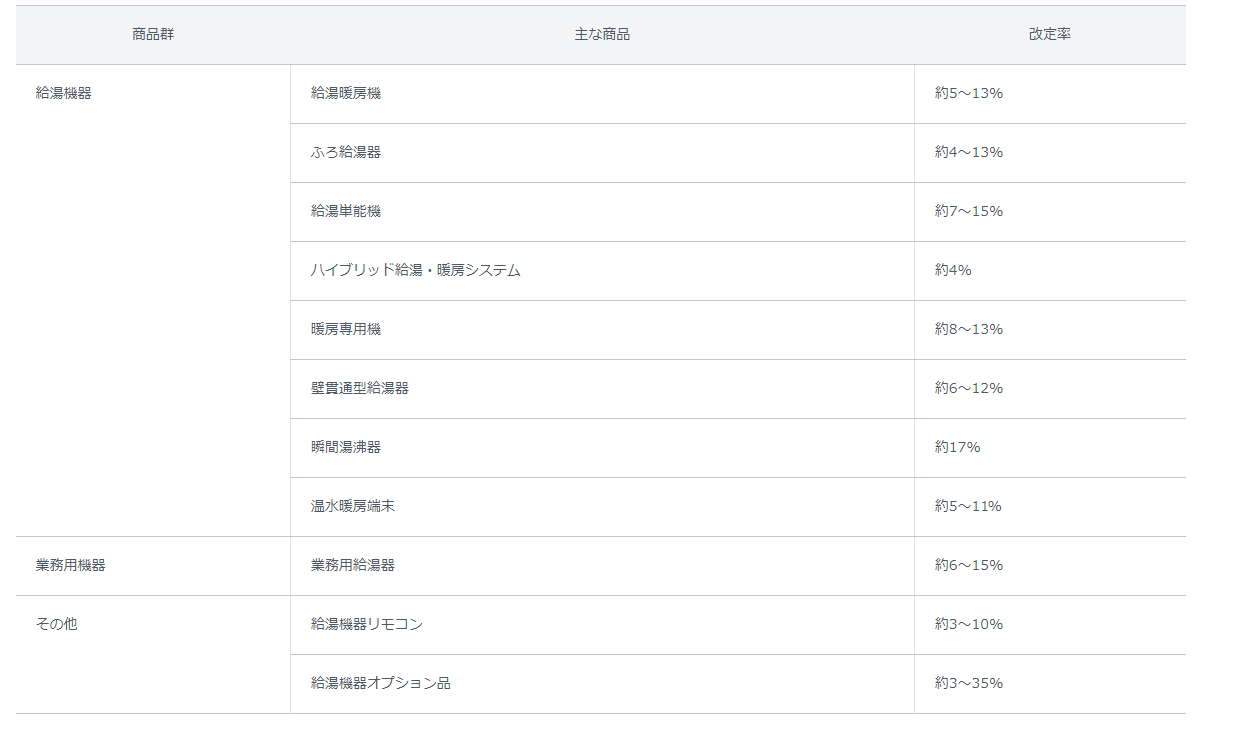 リンナイ(名古屋市)は、給湯機器を7月1日より価格改定する。値上げ幅は4~17%。そのほか、業務用給湯器は6~15%、給湯器リモコン3~10%、同オプション品3~35%―価格改定する。原材料費の高騰や物流費、エネルギー費の上昇が影響し、コスト吸収が困難な状況になったとした。対象製品と改定率は以下の通り。