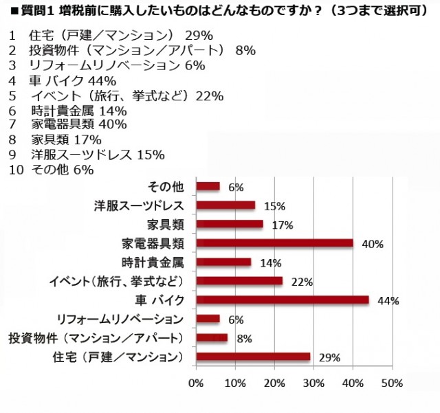 増税前に購入したいものを聞くと、1位「車・バイク」44%、2位「家電・器具類」40%、3位「住宅(戸建て/マンション)」29%が上位を占めた。その理由トップは、「増税後に買うと損だから」47%。