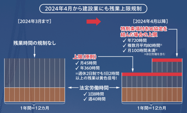 これまで建設業は、36協定で定める時間外労働の上限基準は「適用除外」とし、実質的に5年間猶予されていた。だが、2024年4月1日以降、一般企業と同様に時間外労働は原則として月45時間・年360時間が上限となる。週休2日制でも、1日2時間も残業すれば上限に達する可能性が高くなるのだ。