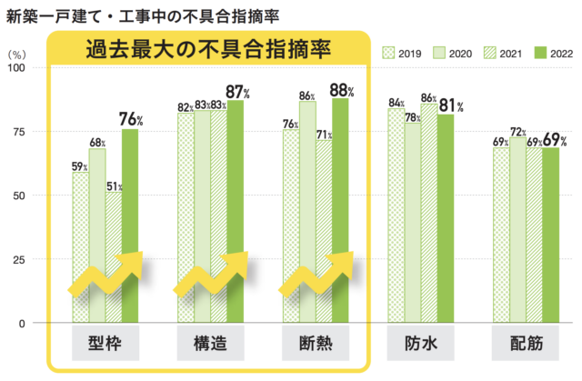同調査は、工事中にホームインスペクターが各工程で検査を行い、施工不良などを指摘する「新築工事チェック(建設途中検査)」の結果を集計、分析したもの。基礎の型枠、配筋、構造、断熱、防水の5項目に分類して集計した。2019年からの4年間で不具合指摘率が最も高くなったのは型枠(76%)、構造(87%)、断熱(88%)の3項目。19年比で見ると、構造は5ポイント、断熱は12ポイント、型枠は17ポイントの増加となった。また、断熱と防水は、過去4年間の指摘率が平均75%を超えた。指摘される事項は・・・
