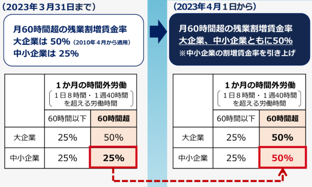 明日、4月1日から中小企業を対象に月60時間を超える時間外労働の割増賃金率が50%に引き上げられる。2010年4月に施行された改正労働基準法によるもので、大企業についてはすでに適用されている。猶予期間として、これまで中小企業は25%に据え置かれていたが、今後は企業の規模に関係なく、一律1日8時間・1週40時間を超える労働時間に対して、60時間以下は25%分、60時間以上は50%分の時間外賃金を支払う義務が生じる。