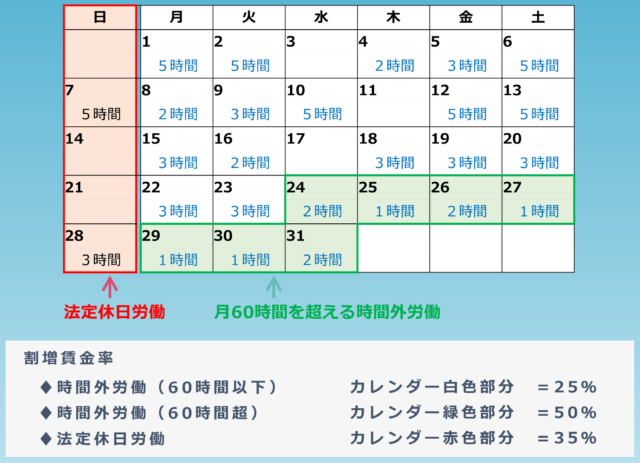 例えば、週休2日制(土日休み)の企業の場合、土曜日の労働は時間外労働として25%(または50%)で計算。日曜日の労働は法定休日労働として35%で計算する。