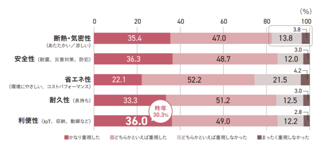 重視した住宅性能について、昨年と比較して特に大きく変化していたのは「利便性」を「かなり重視した」層で、前回の 30.3%から36.0%に増加。Q1の結果も踏まえると、多くの生活者がここ 1 年間でより生活動線を意識するようになったと読み取れる。