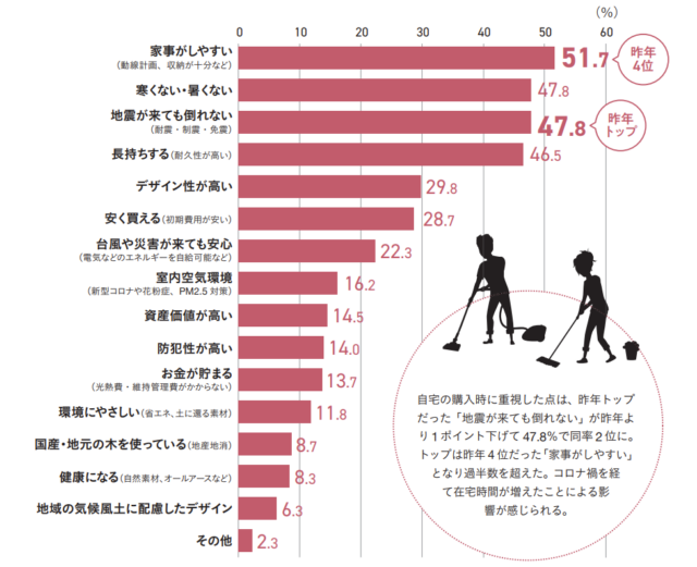 自宅の購入時に重視した点は、昨年トップだった「地震が来ても倒れない」が昨年より1ポイント下げて47.8%で同率2位に。トップは昨年4位だった「家事がしやすい」となり過半数を超えた。コロナ禍を経て在宅時間が増えたことによる影響が感じられる。