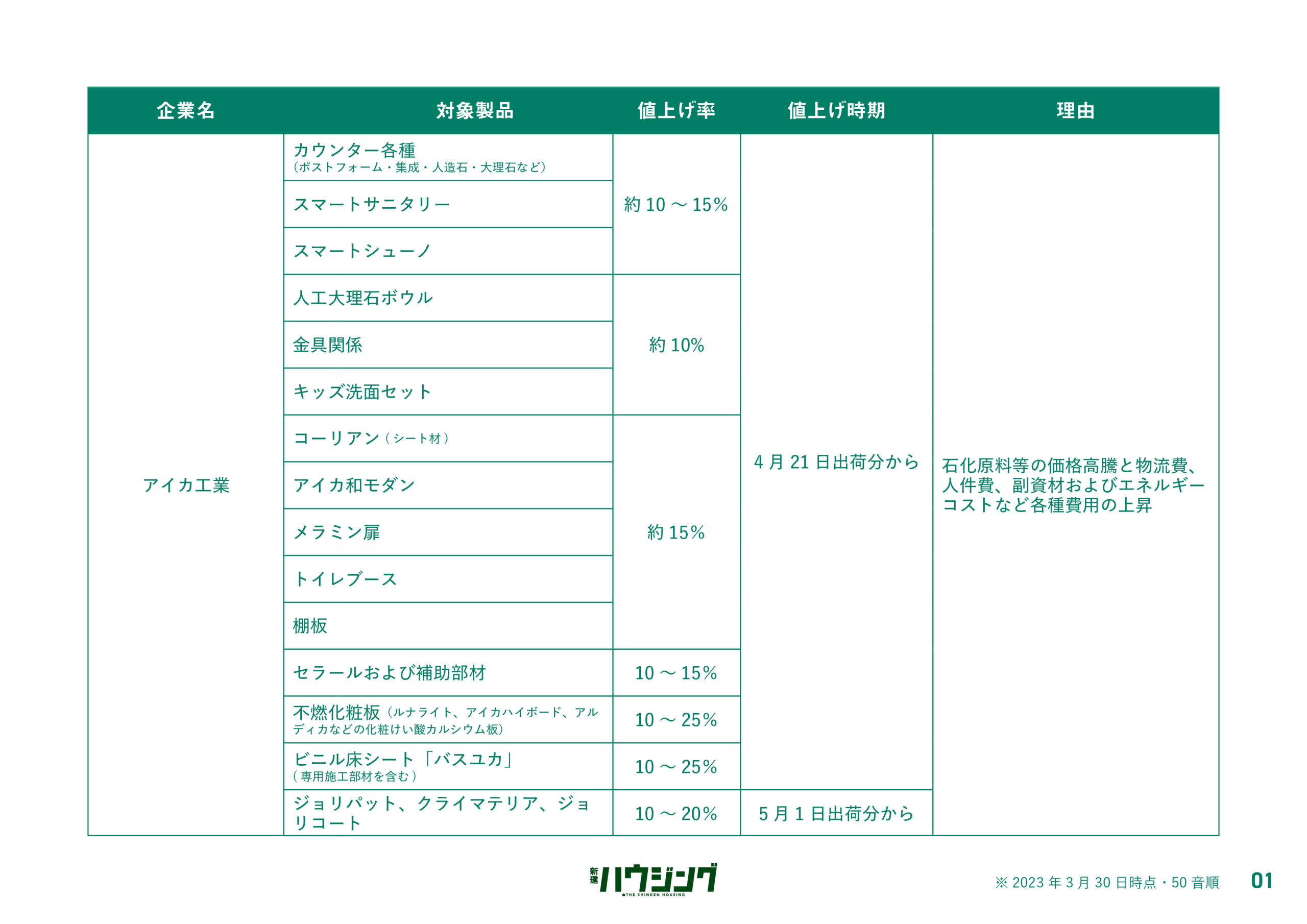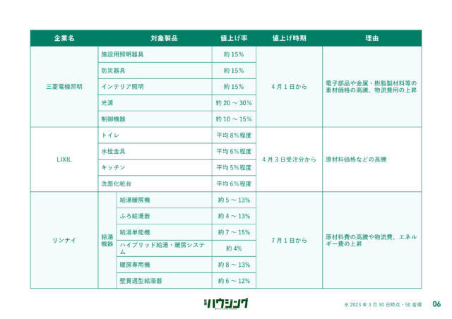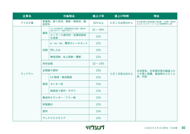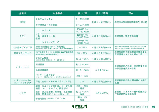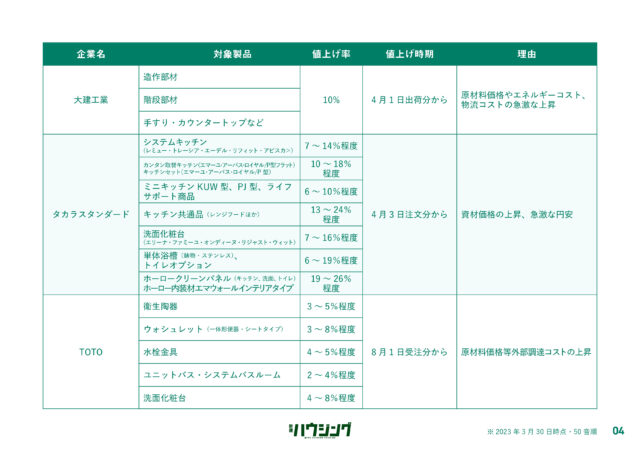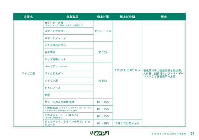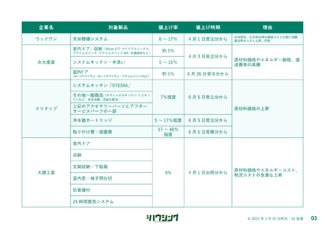 過ごしやすい陽気とともに「値上げの春」が到来しようとしている。新建ハウジングDIGITALでは、4月1日以降に値上げする主要メーカーの建材・設備のリストを集計した。各社は、原材料の高騰などを背景に価格改定を実施してきたが、エネルギー費や物流費の上昇が依然として継続している状況で、コスト吸収が困難な状況にある。状況が好転する気配は低く、今後も一部製品では価格改定が実施される公算が大きい。詳細は以下の通り。