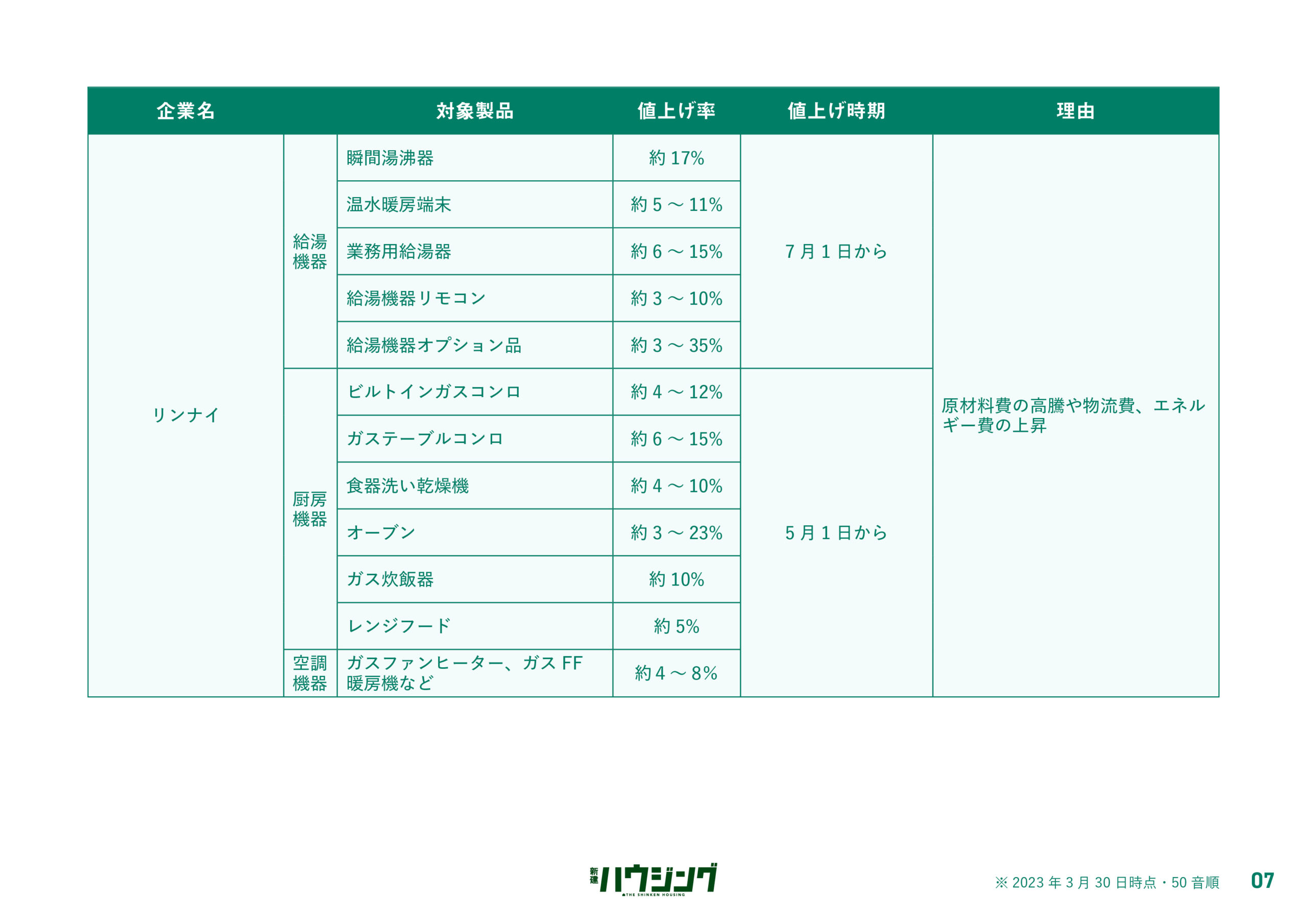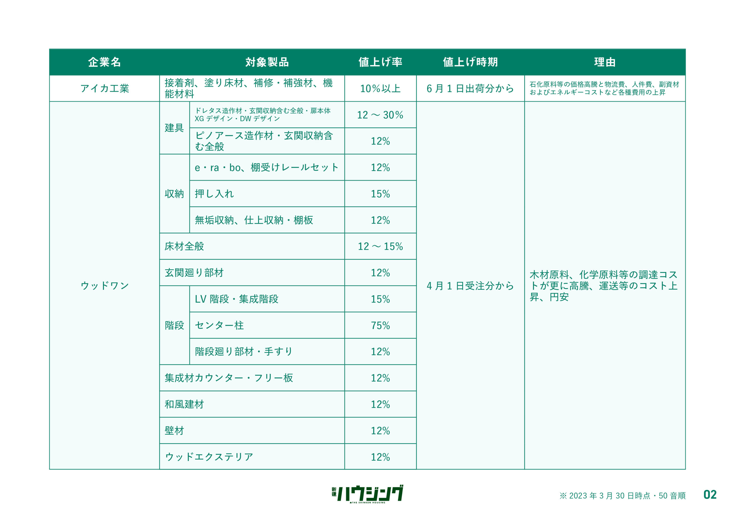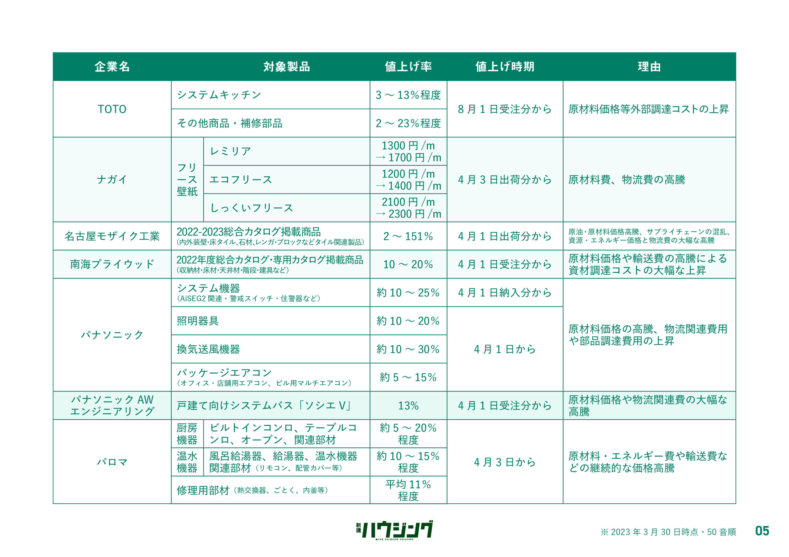 過ごしやすい陽気とともに「値上げの春」が到来しようとしている。新建ハウジングDIGITALでは、4月1日以降に値上げする主要メーカーの建材・設備のリストを集計した。各社は、原材料の高騰などを背景に価格改定を実施してきたが、エネルギー費や物流費の上昇が依然として継続している状況で、コスト吸収が困難な状況にある。状況が好転する気配は低く、今後も一部製品では価格改定が実施される公算が大きい。詳細は以下の通り。