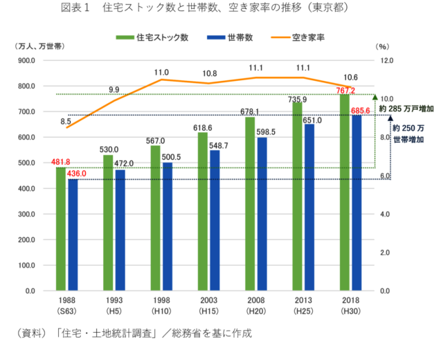 都の「住宅・土地統計調査」によると、都内の2018年時点の空き家数は約81万戸で、10戸に1戸は空き家となっている。このうち「賃貸用の住宅」は約58万戸で、全体の約3割に空き住戸に。さらに「空き家予備軍」とも言える、65歳以上の世帯員がいる単身または夫婦のみ世帯の持ち家は約90万戸となっている。