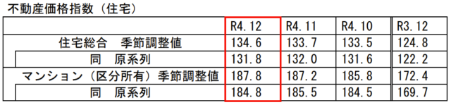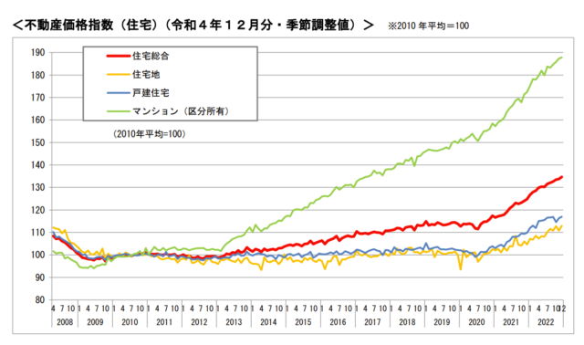 国土交通省は3月31日、2022年12月分の不動産価格指数(季節調整値)を公表した。2010年平均を100として算出したもので、全国の住宅総合は前月比0.7%増の134.6となった。住宅地は同1.8%増の112.9、戸建住宅は同0.6%増の117.0、マンション(区分所有)は同0.3%増の187.8だった。