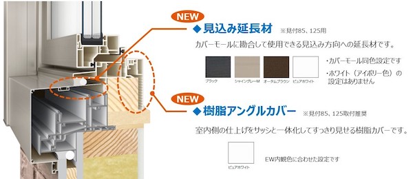 見付寸法85mmと125mmの2種類に加え、カバーモールに嵌合して使う「見込み延長材」、室内側の仕上げをサッシと一体化させる「樹脂アングルカバー」をラインアップして現場対応力を高めている。