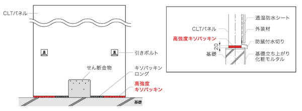 CLT工法など中大規模の木造建築が登場したことにより、基礎パッキンに従来よりも大きな荷重がかかるケースが増えてきた。これに対応するため、高耐力が必要な建物や部位に使用できるよう従来品の約2倍の強度を備えたFRPP製の基礎パッキンを開発。