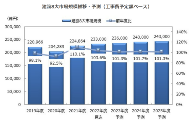2025年度は、工事費予定額ベースで24兆3000億円(2021年度比108.1%)と予測。2025年度にかけて、大都市圏の都心部及び地方都市部での再開発計画が控えているほか、製造業の国内回帰による設備投資需要も活況を呈している。また、2025年以降、大阪・関西万博の開催やIR(統合型リゾート)の開業も控える中で、2025年度までの建設8大市場は堅調に推移すると予測・分析した。