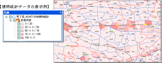 同社の住宅地図をベースとして、行政界毎の建物の分布を集計・統計化。国勢調査や住民基本台帳などの一般的な統計データによるターゲットの絞り込みのほか、建物種別や規模に着目したエリアマーケティングができる。