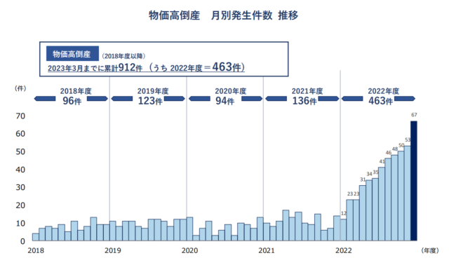帝国データバンクは「物価高倒産」を、法的整理(倒産)企業のうち、仕入れ価格上昇や取引先からの値下げ圧力等で価格転嫁できなかった「値上げ難」などで、収益が維持できずに倒産した企業と定義。長期化する物価高の状況下で、「物価高倒産」は9カ月連続で最多を更新しており、「今後も増加傾向で推移していくものとみられる」としている。