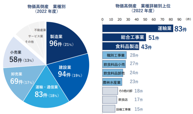 「物価高倒産」の業種詳細別では、「運輸業」(83件)でトップ。以下、「総合工事業」(51件)、「食料品製造」(43件)「職別工事業」(28件)と続いた。要因別にみると、「原材料」(37.4%)、「エネルギーコスト」(23.7%)、「包装・資材」(20.4%)の順となっている。