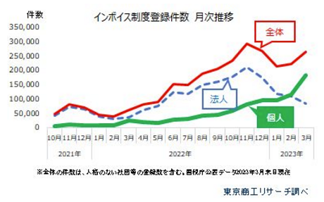 東京商工リサーチ(東京都千代田区)は、10月1日に運用が開始されるインボイスの登録件数が、3月末時点で累計268万件に達したと発表した。法人と比べて登録が進んでいなかった個人事業主だが、3月の登録数は法人の2倍超となる18万1032件で、累計85万6060件に達した。経過措置の効果や取引先からの要請、業務委託契約者の登録が影響したとみられる。登録率は、法人が97.1%、個人事業主が43.2%。