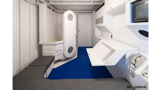 取得したカプセルをトレーラー化するにあたっては、積載重量の基準をクリアするために軽量化が必要になり、中銀カプセルタワービル竣工当時の内装への再生過程で、当時の家具をすべて復元する一方で、構造体の一部を間引きすることで軽量化を図ったいう。トレーラー化によって、これまでの中銀カプセルにはなかった“動く”という特性とスケルトンの仕様が加わり、竣工当時を彷彿させつつも新たな趣を帯びた仕上がりとなった。