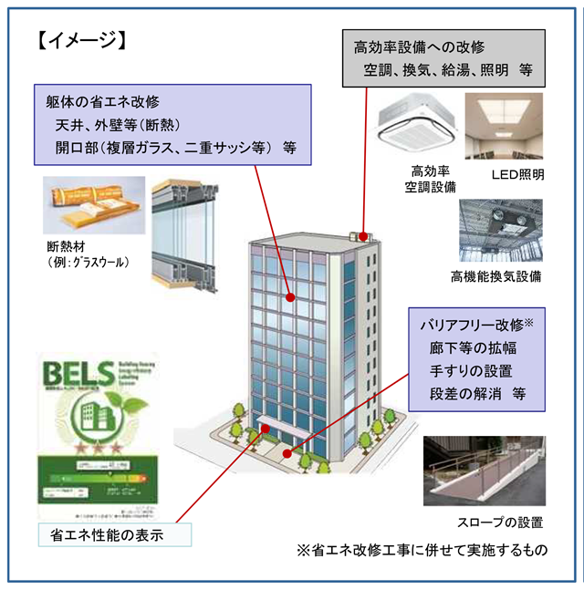 対象事業は、オフィスビルなどの既存建築物の構造躯体(外皮)、建築設備の省エネルギー改修工事。省エネルギー改修に加えてバリアフリー改修を行う場合も対象。工場・実験施設・倉庫などの生産用設備の改修、後付の家電の交換などは対象外となる。