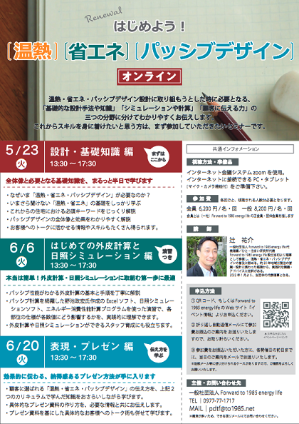 Forward to 1985 energy life(大分県別府市)は、オンラインセミナー「はじめよう!温熱・省エネ・パッシブデザイン」を、5月23日、6月6日、6月20日の3日間にわたって開催する。