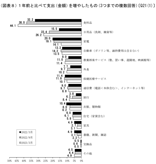 収入については、1年前と比べて「増えた」が11.1%で前回調査より増加。「減った」は36.3%だった。「変わらない」は52.1%。支出については「増えた」が60.2%、「減った」が12.7%。中でも支出が増えた(増やした)のは、「食料品」(44.1%)、「日用品(洗剤、雑貨等)」(26.2%)、「家電」(14.1%)などだった。