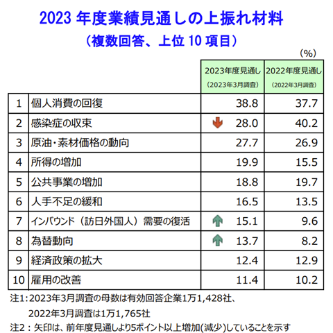 2023年度の業績見通しを上振れさせる材料を尋ねたところ、「個人消費の回復」が38.8%と3年ぶりにトップとなった。2年連続で最も高かった新型コロナなどの「感染症の収束」は 28.0%で2番目となったが、前回調査(2022 年3月)より12.2ポイントも減少した。以下、「原油・素材価格の動向」(27.7%)、「所得の増加(19.9%)、「公共事業の増加」(18.8%)が続いた。
