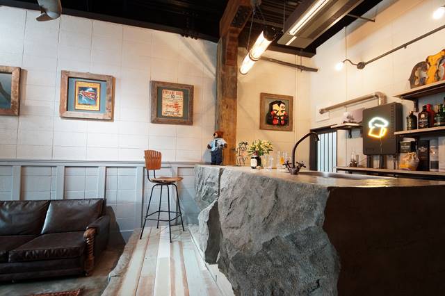 天然石で仕上げたような重厚感のある1Fのバーカウンター。ゲストを招いてパーティーも