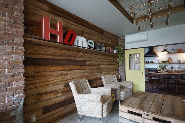 2階リビング。板張りの壁とブリック調の柱、床はコンクリート。カリフォルニアに佇むレンガ造のアパートメントをイメージした