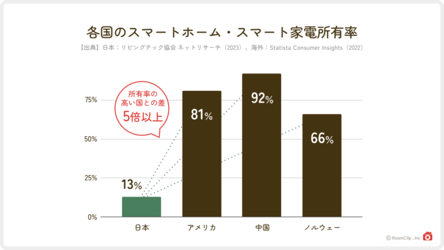 各国のスマートホームおよびスマート家電の所有率を見ると、「アメリカ」(81%)、「中国」(92%)、「ノルウェー」(66%)であるのに対し、日本では13%(総務省「情報通信白書」令和4年版では9.3%)と低い値になっている。「日本は専業主婦が家庭を支えているからとか、賃貸が多いからハードルが高いのだと言われるが、ジェンダー別の就業率や持ち家率を見ると海外との大差はない」と竹内さん。