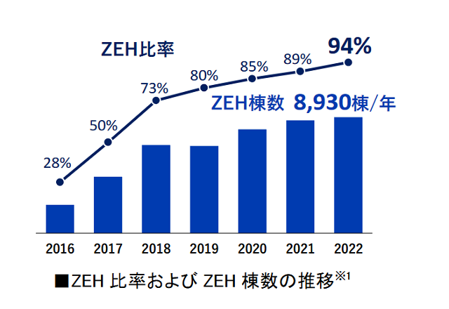 このうちエネルギー削減率が最も大きい「ZEH」の比率は、前年比6ポイント増の88%と過去最高を更新。同社は、再エネを含む正味のエネルギー削減率が100%以上のZEHの普及に注力しており、大容量PVを搭載した環境貢献度の高い住まいを積極的に提案することで、脱炭素社会の実現に貢献するとしている。