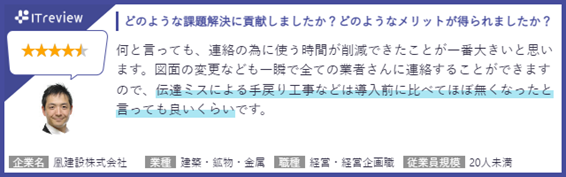 現場Plusは、満足度と認知度が高い製品におくられる「Leader」を、施工管理システム部門、その他顧客管理部門、図面管理部門、勤怠管理システム部門の4部門で受賞。顧客満足度の優れた製品におくられる「High Performer」では、ビジネスチャット部門、タスク管理部門、チームコラボレーション部門、工事写真部門、工事情報共有部門の5部門で受賞した。使いやすい操作性とコストパフォーマンス、導入前後の手厚いサポートが高く評価された。どちらの部門も3期連続の受賞。