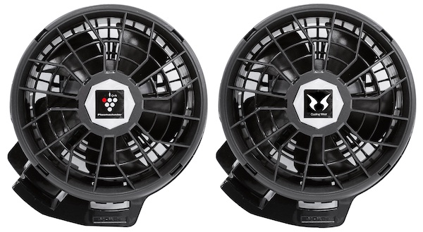 電動ファンやバッテリーは着脱可能。長袖タイプやベストタイプなどが選べるウェア本体とファン、バッテリーを個別でも販売しているため、既存の空調風神服にプラズマクラスターデバイス搭載のファンを後付けすることもできる。