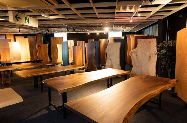 同社は約10年前から一枚板事業に取り組んでおり、社内には約6000枚をストックし、仕入れた板を最低約2年間自然乾燥している。子会社に加工工場を持ち、管理から加工、仕上げ塗装まで一貫して行っている。