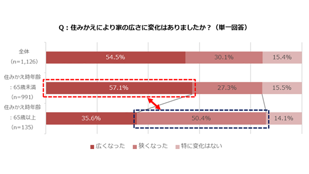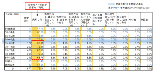 住み替え前の持家を活用している割合は約8割(「売却」75.0%、「賃貸化」2.6%、「除却・住宅以外利用」0.2%)を占めた。そのほか「週末利用」3.0%、「親族居住」6.6%、「空き家」7.0%、「生前贈与」は1. 8%だった。また、持家に対する子どもの意向としては、「売却」が35.2%で最も多かった。売却の理由としては、「住み替え費用または生活資金を確保するため」が57.6%と最も多い。しかし「価格が期待より低かった」との回答が41.3%を占めた。賃貸化した人も「賃貸のためのリフォーム費用がかさんだ」22.7%、「賃料が期待より低い」13.6%などの課題を挙げている。一方、空家に関しては、53.0%が「売却したい」と回答したが、「決めていない」も29.9%あった。