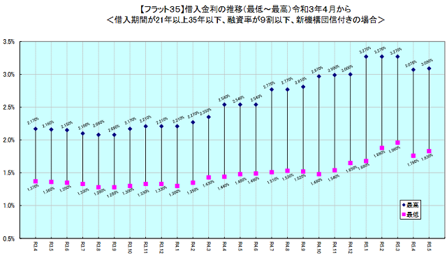 返済期間21年以上35年以下の最低金利は、融資率9割以下が1.83%、9割超が1.97%と、いずれも前月から0.07ポイント上がり、2カ月ぶりに上昇した。最高金利は、9割以下が3.09%、9割超が3.23%で、前月から0.02ポイント上昇した。