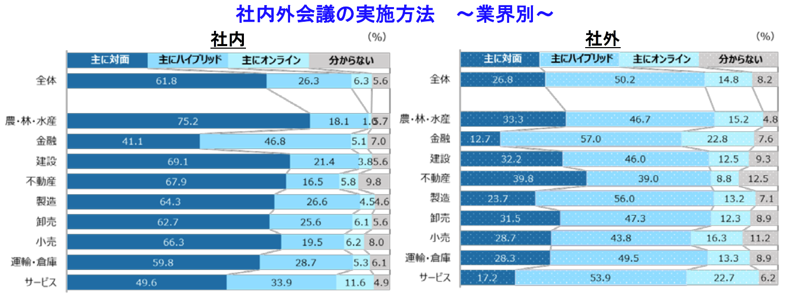 社内会議の実施方法について業界別にみると、「農・林・水産」や「建設」など業務上現場での作業が多い業種において「主に対面で実施」の割合が比較的高く、「主にハイブリッドで実施」および「主にオンラインで実施」の割合は低かった。一方、「金融」や「サービス業」ではオンライン会議を積極的に導入している割合が高く、社外会議についても同様の傾向がみられた。