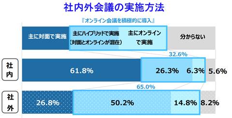 社外会議についても、社内会議と同様、企業規模が大きいほどオンライン会議を実施する企業の割合が高かったが、中小企業でも5割近くが「主にハイブリッドで実施」(48.0%)を占めており、「主にオンラインで実施」(14.7%)と合わせると、社外会議を実施する際、オンライン会議を積極的に導入している割合は62.7%にのぼった。