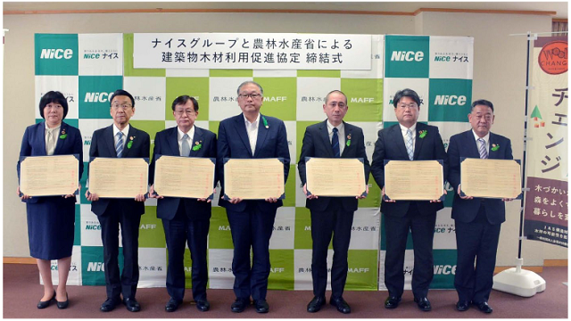 ナイス(横浜市)は5月9日、農林水産省とグループ会社であるウッドファースト(徳島県小松島市)、ナイスプレカット(横浜市)、ナイスユニテック(横浜市)、菊池建設(横浜市)、YOUテレビ(横浜市)の7者で「国産材の利用拡大に関する建築物木材利用促進協定」を締結したと発表した。有効期間は2028年3月31日まで。